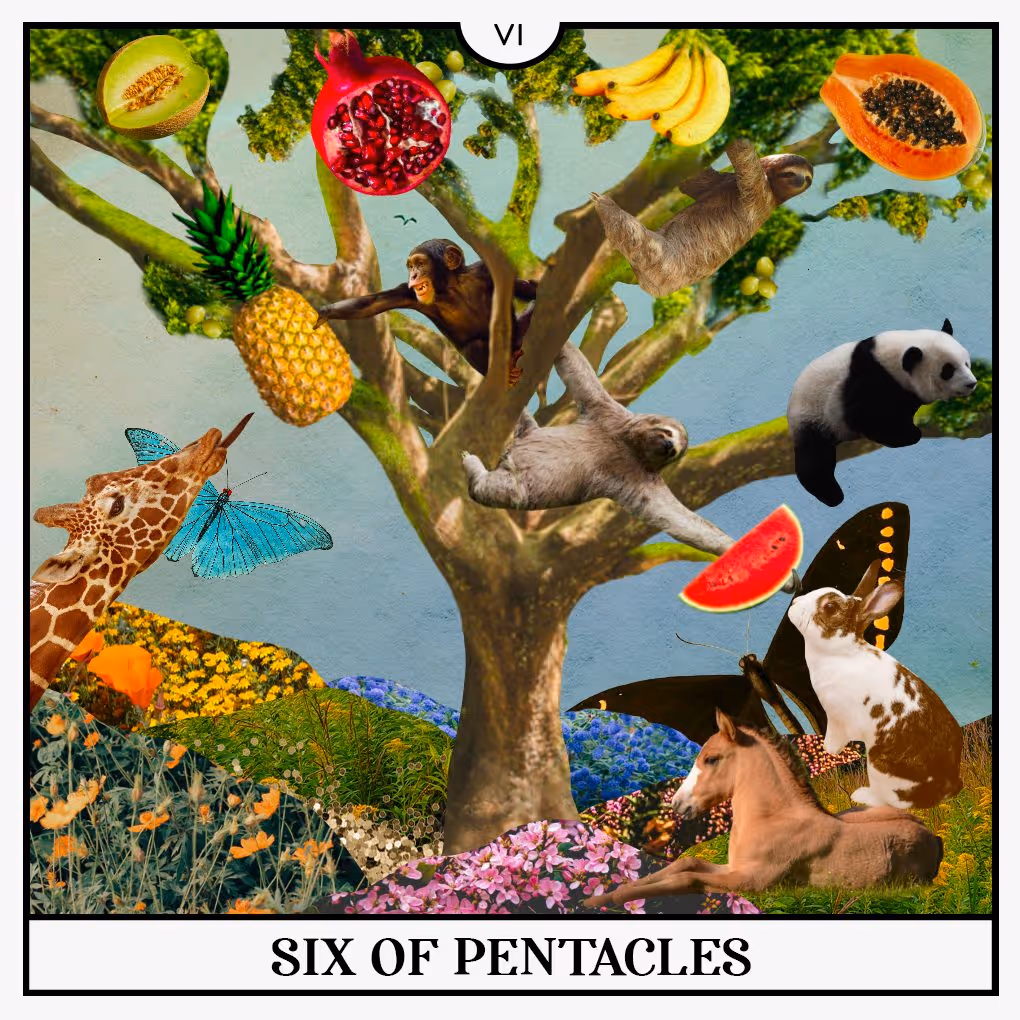 Tarot card of the week 🃏 … The Six of Pentacles is this week’s tarot card because it corresponds to the second decan of Taurus (part of the zodiac), where the solar eclipse is happening. This card is generative and invites us all to do the difficult work of learning how to receive. The myth of the self-made person is embedded so deeply in capitalism that many of us regard generosity with suspicion. The truth is, the act of giving heals and uplifts the benefactor as much as the receiver. Gifts create sacred ties of intimacy and keep the honey flowing. This card begs the questions, in what ways is your cup currently overflowing? How can you share your excess? What are you learning about asking for and receiving the help you need?