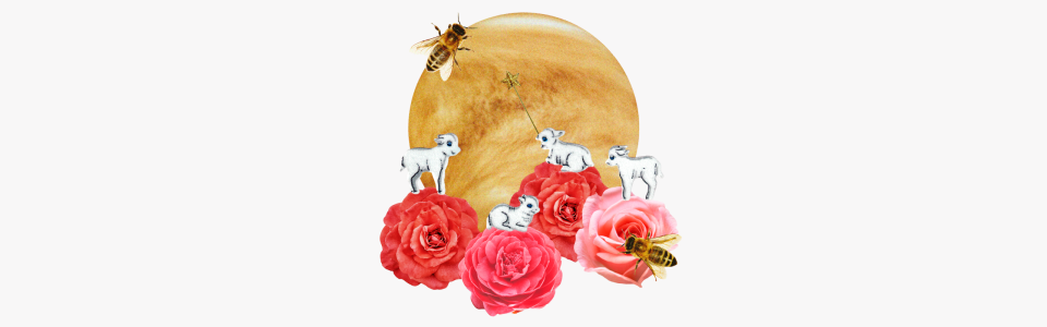 Horoscopes for Venus in Cancer — Collage of a clam with a pearl, a magic wand, two dogs, roses, two starfish, and a heart.